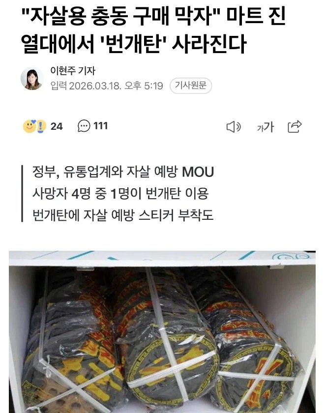 '자1살용 충동구매 막자' 마트 진열대에서 번개탄 사라진다 Anonymous | 2026.03.19 09:34 | 조회 12 https://qquing.net/bbs/board.php?bo_table=humor&wr_id=1858310 주소 복사 이전글 다음글 랜덤 만화 목록 본문 흠... 자1살할 사람이 번개탄 없어서 자1살을 포기할까 싶은데... 추천 0 비추천 0