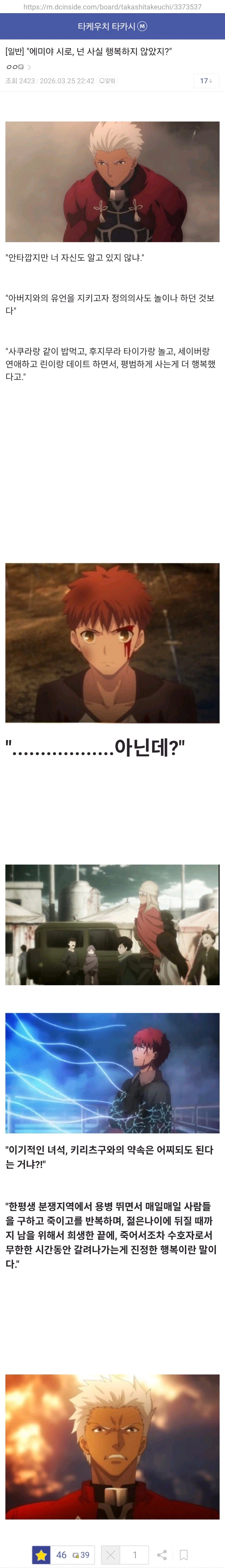 "에미야 시로는 사실 행복하지 않았지?" Anonymous | 2026.03.26 09:28 | 조회 11 https://qquing.net/bbs/board.php?bo_table=humor&wr_id=1868293 주소 복사 이전글 다음글 랜덤 만화 목록 본문 추천 0 비추천 0