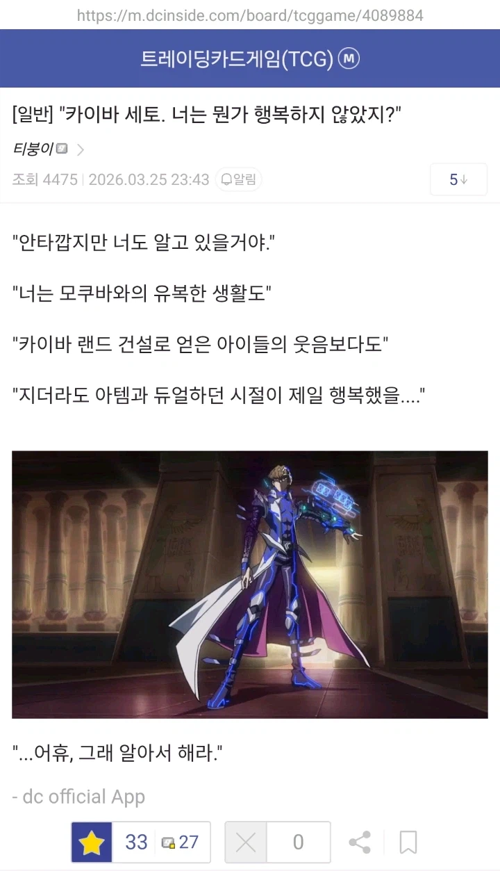 "카이바 세토. 너는 뭔가 행복하지 않았지?" Anonymous | 2026.03.26 21:55 | 조회 11 https://qquing.net/bbs/board.php?bo_table=humor&wr_id=1869104 주소 복사 이전글 다음글 랜덤 만화 목록 본문 추천 0 비추천 0