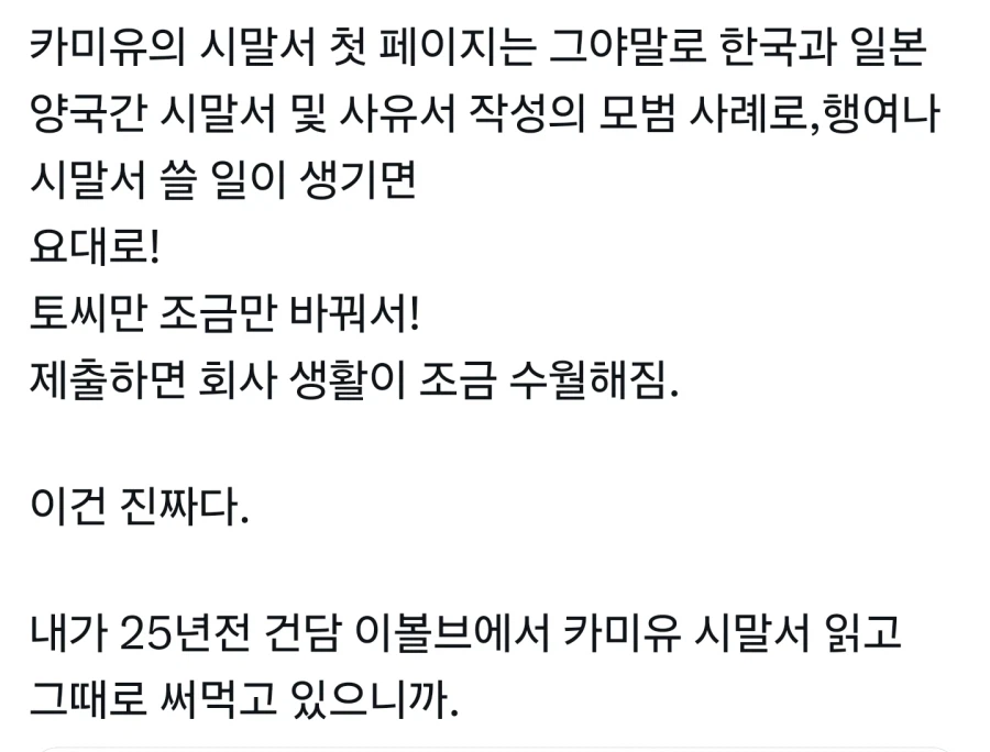 "교과서적인 시말서 작성 예시" Anonymous | 2026.03.28 02:12 | 조회 6 https://qquing.net/bbs/board.php?bo_table=humor&wr_id=1870821 주소 복사 이전글 다음글 랜덤 만화 목록 본문 누가언제어디서무엇을왜어떻게 잘못했는지 적고 죄송하다 느끼는바 적고 개선방안 적고 작성날짜 / 이름 / 직위 / 소속 그리고 결제란까지 완벽 추천 0 비추천 0