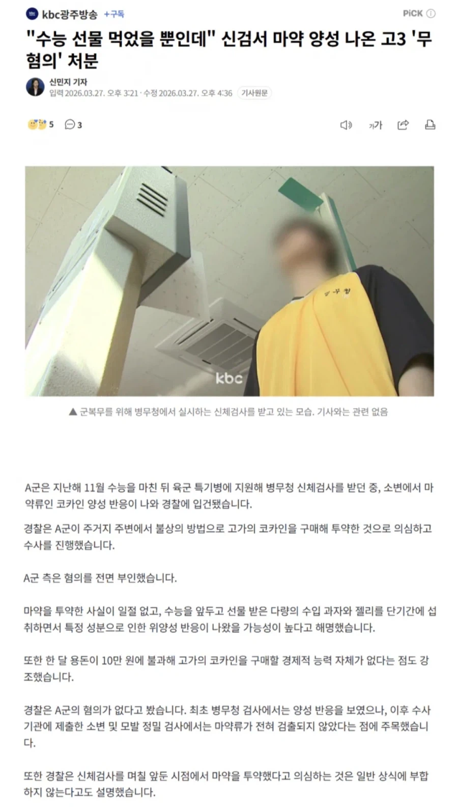 "수능 선물 먹었을 뿐인데" 신검서 마-약 양성 나온 고3 무혐의 처분.jpg Anonymous | 2026.03.28 04:08 | 조회 7 https://qquing.net/bbs/board.php?bo_table=humor&wr_id=1870887 주소 복사 이전글 다음글 랜덤 만화 목록 본문 추천 0 비추천 0
