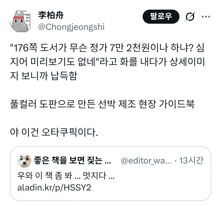 "176쪽 도서가 무슨 정가 7만 2천원이나 하냐? " Anonymous | 2026.04.01 15:10 | 조회 7 https://qquing.net/bbs/board.php?bo_table=humor&wr_id=1876808 주소 복사 이전글 다음글 랜덤 만화 목록 본문 개쩜... 추천 0 비추천 0