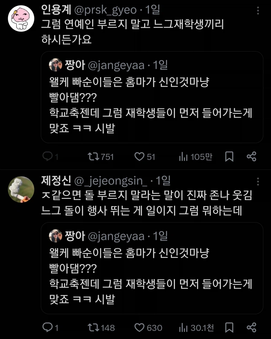 "연예인들 실직하고 굶어죽어라" Anonymous | 2026.04.03 14:34 | 조회 14 https://qquing.net/bbs/board.php?bo_table=humor&wr_id=1879273 주소 복사 이전글 다음글 랜덤 만화 목록 본문 홈마 : 대충 공연 도촬 유포꾼 "홈마가 꼬우면 행사에 연예인 부르지 마라" 추천 0 비추천 0