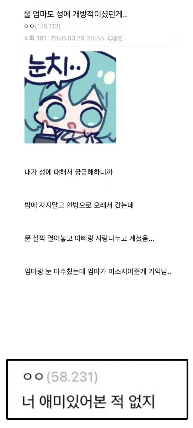 "우리 엄마는 성에 개방적이셨던게..." Anonymous | 2026.04.10 13:12 | 조회 10 https://qquing.net/bbs/board.php?bo_table=humor&wr_id=1888150 주소 복사 이전글 다음글 랜덤 만화 목록 본문 추천 0 비추천 0