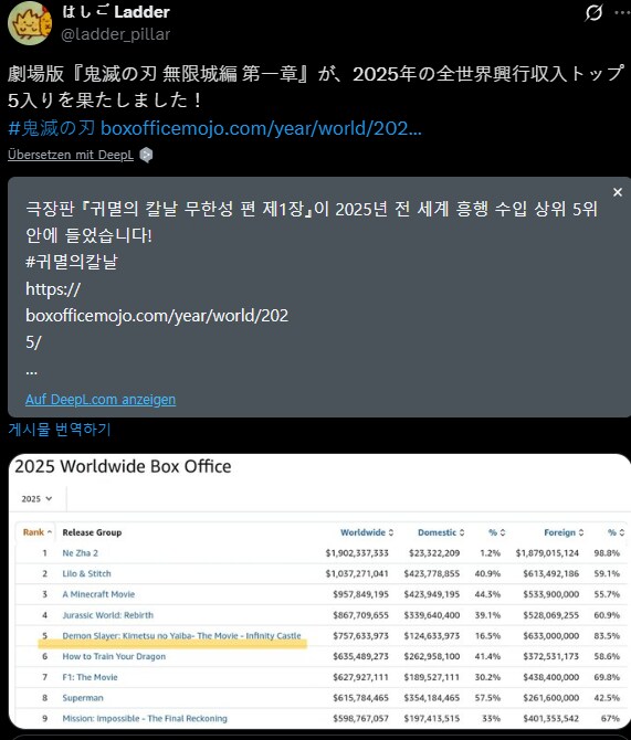 귀멸) 드래곤 길들이기를 제치고 전세계 흥행 순위 5위에 오름 Anonymous | 2025.10.07 01:35 | 조회 289 https://qquing.net/bbs/board.php?bo_table=manga&wr_id=3622037 주소 복사 이전글 다음글 랜덤 만화 목록 본문 무한성 영화가 흥할 거라 예상하긴 했지만 이 정도일 줄은 몰랐는데 대단하네. 한편으론 2편 제작에 걸리는 부담이 더 늘어날듯ㅎㅎ 추천 0 비추천 0