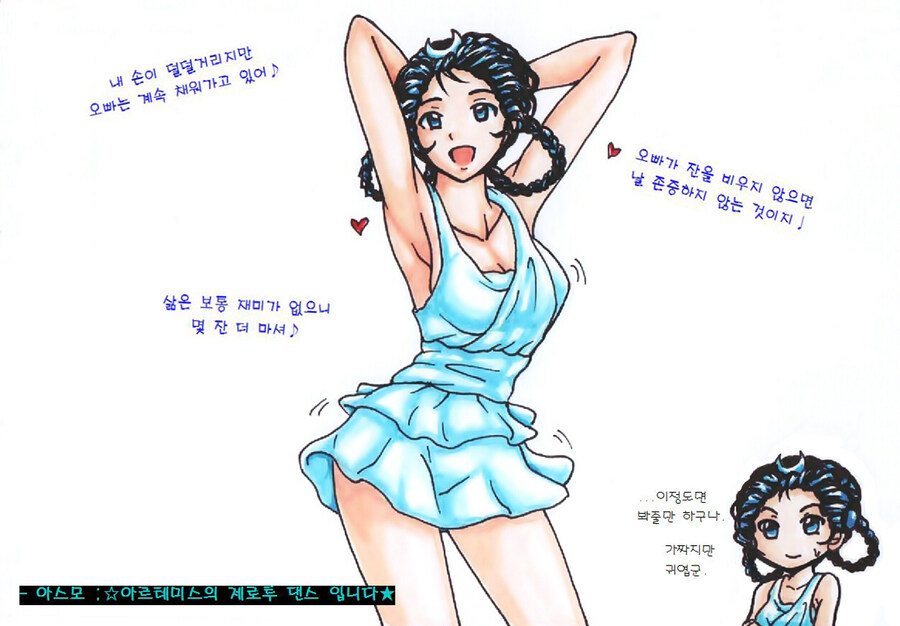 만화로 보는 그리스로마신화 아르테미스 & 제로투댄스 Anonymous | 2025.10.06 20:59 | 조회 307 https://qquing.net/bbs/board.php?bo_table=manga&wr_id=3621543 주소 복사 이전글 다음글 랜덤 만화 목록 본문 (위 세 장은 개인 창작, 밑은 공식) 홍은영 작가의, " 만화로 보는 그리스 로마신화"의 등장 캐인 "아르테미스"입니다. 아는 분은 알다시피 올림포스 주신들 중 하나로 달과 사냥 그리고 순결의 여신임과 함께 교육, 학습용 만화의 등장 캐로 유명하죠.하지만 진짜 유명한 건 순결미와 함께 꼴릿외모+얀데레 성향으로 인해 그때 그 시절 잼민이들의 마니악한 아이돌(?)의 대상입니다.제로투댄스와 콜라보함으로서 의외성과 재미를 표현해봤습니다! 추천 0 비추천 0