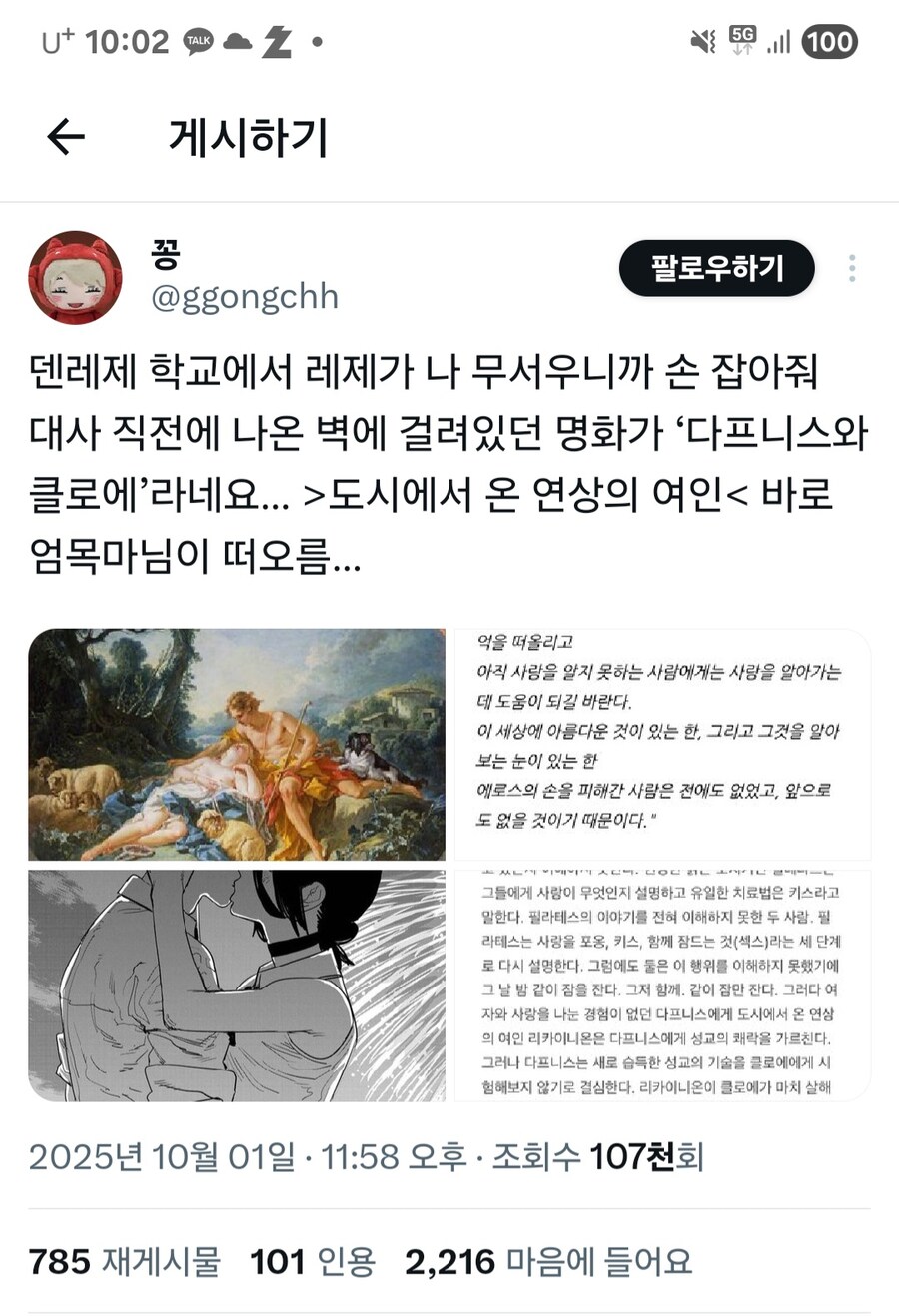 체인소맨)레제 극장판이 미친 순애물인 이유 Anonymous | 2025.10.11 10:19 | 조회 378 https://qquing.net/bbs/board.php?bo_table=manga&wr_id=3632238 주소 복사 이전글 다음글 랜덤 만화 목록 본문 덴지는 말만 색무새인 놈이 맞다 추천 0 비추천 0